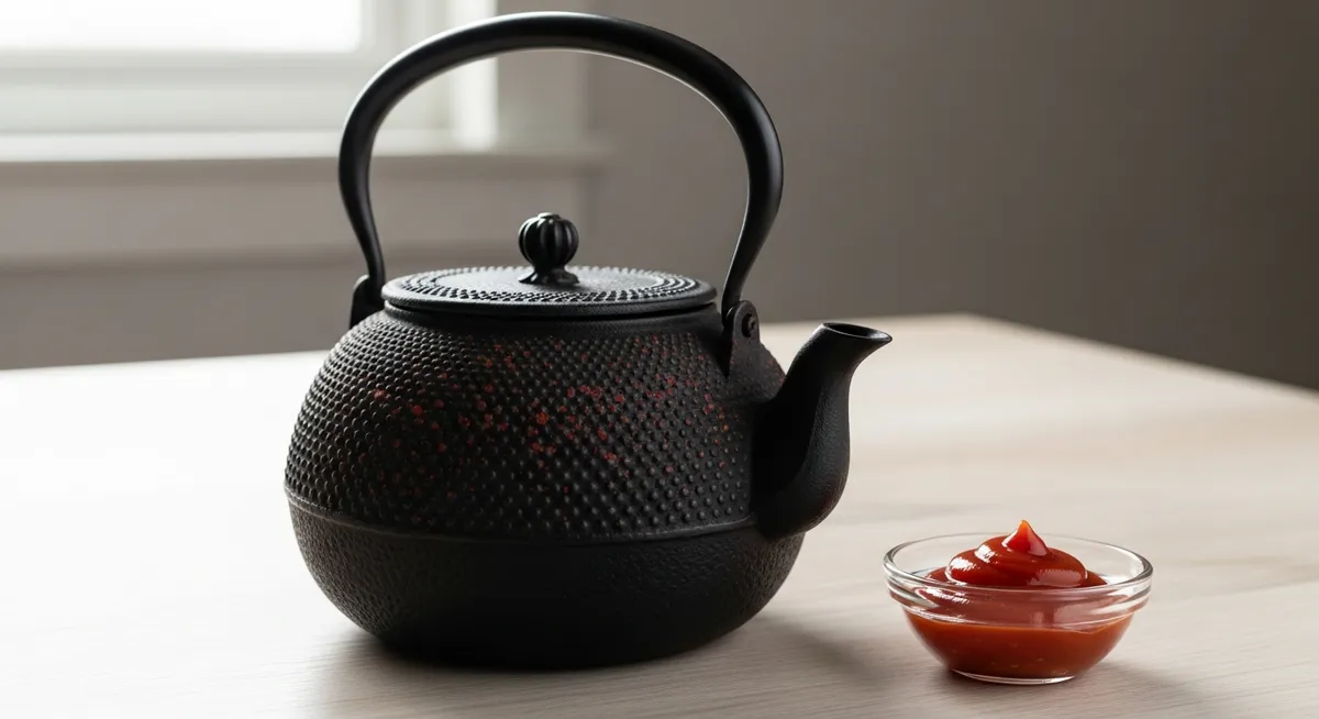 南部鉄器の表面に浮いた赤錆は、身近なケチャップで驚くほどきれいに落とせます。
